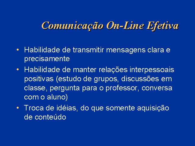 A educação on-line é estruturada sobre a dinâmica da comunicação humana e busca os equivalentes tradicionais como estudo de grupos, discussões, em classe, pergunta para o professor, conversa com o aluno.