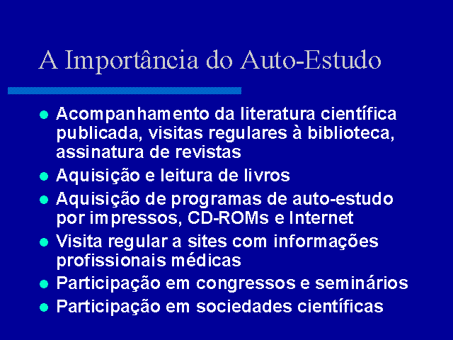 O profissional de saúde competente é capaz de uma grande autonomia na definição de seus objetivos educacionais na carreira, e na realização de atividades que permitam implementá-las. Por isso, o auto-didatismo é extremamente importante, pois independe de tempo ou espaço, podendo ser acomodado entre as atividades diárias do profissional. Para orientar-se o que precisa aprender, é interessante visitar regularmente congressos e seminários, e participar de pelo menos uma sociedade científica em sua sociedade. Existem atualmente diversos recursos de informação que permitem o auto-aprendizado, como bibliotecas médicas, sites on-line, programas de auto-estudo fornecidos por empresas e universidades, que usam materiais impressos, CD-ROMs, etc.