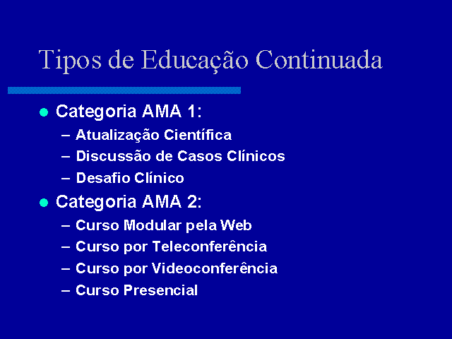 Existem várias atividades de ensino e aprendizagem que poderíamos considerar como sendo parte da educação médica continuada. A American Medical Association, que é a líder inconteste nessa área, especifica dois tipos de categorias: 1 e 2. A categoria 1 consiste de atividades mais voltadas ao auto-aprendizado, com nenhum ou moderado grau de interação. A atividade 2 consiste de cursos propriamente ditos, usando vários meios a distância e presenciais. O sistema funciona à base de créditos educacionais (um número de pontos ligado a cada curso, que podem ser acumulados pelo médico, e usados para vários propósitos, como recertificação, currículo, etc.).