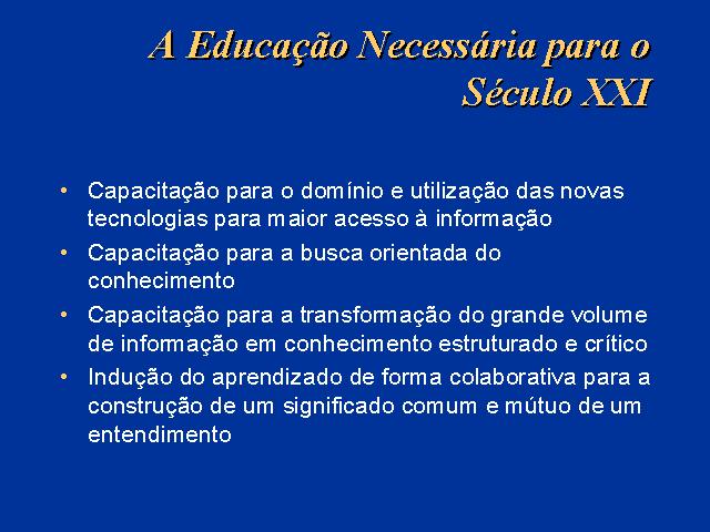 A educação do futuro vem exigindo o desenvolvimento de um modelo pedagógico específico e especial. Com o atual estágio de evolução dos conhecimentos e tecnologias em saúde, se faz cada vez mais necessária uma modificação estrutural do ensino em saúde que privilegie a formação de indivíduos com excelente visão genérica da medicina e com a necessária habilidade de buscar constantemente sua especialização e atualização profissional. A grande mudança passa pela forma com a qual se dará a transmissão de conhecimentos. Na era da informação, com a grande velocidade e democratização de acesso aos avanços e novas descobertas, a figura do professor deverá ser aquela de um orientador para que o próprio aluno aprenda a buscar os conhecimentos necessários. Somente assim, teremos um médico capaz de se adequar às constantes e inexoráveis mudanças em sua realidade profissional, evitando que seus conhecimentos se tornem obsoletos muito rapidamente (F.H. Mendes).