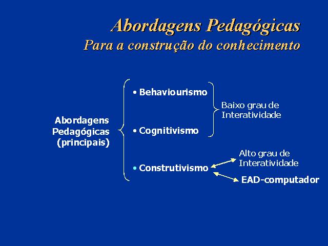 - COGNITIVISMO: Nesta abordagem, o professor transfere o conhecimento dele para o aluno. Ele ensina descrevendo os fatos/fenômenos com suas causas/origens (situação de aceitação passiva por parte dos alunos diante do professor “sabe-tudo”, muito freqüente no atual modelo brasileiro de ensino ? uso restrito de fontes de informação como bibliotecas)