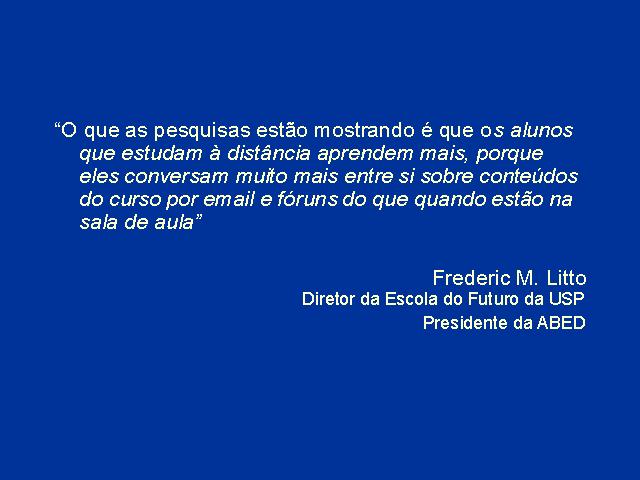 Esta frase mostra a importância do processo colaborativo entre os alunos, e de como a educação a distância depende tremendamente da ocorrência desse processo. Todo mundo sabe que, em aula expositiva, são poucos os alunos que se levantam para fazer comentários ou perguntas. Na EAD, esse processo pode se tornar ainda mais prejudicial, se o ambiente da EAD não favorecer enormemente a troca intensa de informações entre os participantes. Quando isso acontece, nota o Prof. Litto, o grau de interação pode até aumentar em relação ao ensino presencial.