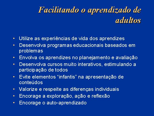 Assim, o desenvolvimento de programas educacionais a distância para aprendizes adultos devem levar em consideração essas características e moldar os recursos e estratégias pedagógicas de acordo. Particularmente importante é envolver os aprendizes no próprio desenrolar do curso, permitindo que eles sugiram mudanças nessas estratégias e recursos à medida que forem avaliando o seu próprio desempenho, dificuldades e facilidades. É importante também valorizar as diferenças individuais na interação, e dar condições metodológicas para a participação mais intensa de todos, através do compartilhamento de experiências e opiniões, contribuição de informações obtidas através da exploração, ação e reflexão, etc.