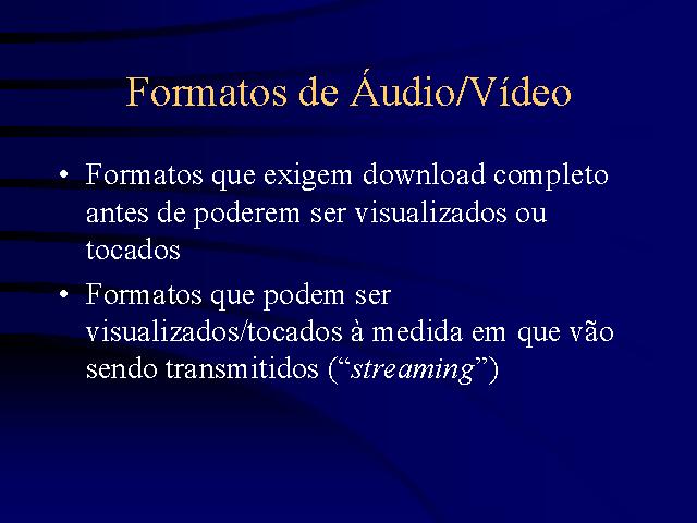 Para resolver esse problema, foi criada a tecnologia de “streaming”, cuja visualização basicamente independe do tamanho ou duração da midia original, podendo inclusive ser transmitido em tempo real (transmissão continua, de duração indeterminada). Isso revolucionou a Web quanto aos formatos de áudio e vídeo.