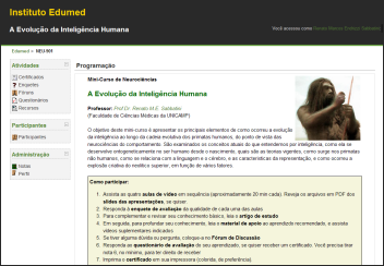 O objetivo geral deste curso é apresentar os principais elementos de como ocorreu a evolução da inteligência ao longo da cadeia evolutiva dos primatas humanos, do ponto de vista das neurociências do comportamento. São examinados os conceitos atuais do que entendemos por inteligência, como ela se desenvolve ontogeneticamente no ser humano desde o nascimento, quais são as teorias vigentes sobre o que é a inteligência e seus fatores, como surgiu nos primatas humanos, como se relaciona com o cérebro e linguagem, e as caracteristicas da representação, e como ocorreu a explosão criativa do neolitico superior, em função de vários fatores. Também será discutida a evolução futura da inteligência humana.