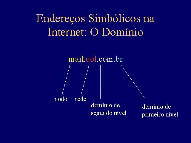 O “host” é o nome simbólico de uma máquina específica em uma rede maior. Por exemplo, a máquina de “mail”, na rede de computadores do Universo On-Line. O tipo de domínio, também chamado de domínio de segundo nível, é atribuido geralmente de acordo com o tipo de domínio (por exemplo, COM para empresas, EDU para universidades, etc.). Finalmente existe o domínio de primeiro nível, que corresponde ao país onde está registrado (mas não necessariamente, hospedado), o nome de domínio completo. Os EUA são o único país dispensado desse sufixo final, mas é opcional o uso de .US.