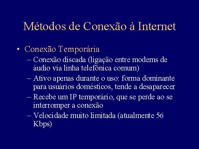 Existem dois métodos de conexão de um terminal à Internet: conexão temporária e conexão permanente.