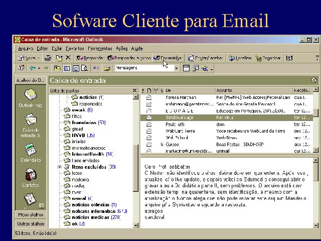 O Microsoft Outlook é um exemplo de software cliente para acesso ao email. Ele permite criar, enviar, receber, responder, re-enviar e encaminhar mensagens. A tele se divide em três: lista de pastas com as mensagens recebidas (Caixa de Entrada), enviadas (Caixa de Saída) e arquivadas, a lista de mensagens em cada pasta (com nome do remetente, assunto e data/hora de recebimento) e o conteúdo da mensagem.