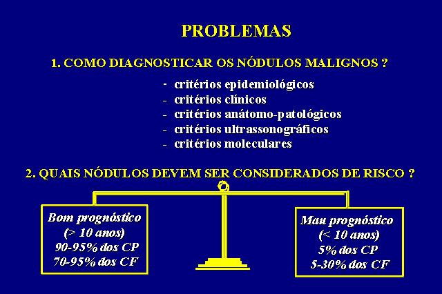 O que nos traz de volta à estaca zero em termos de conduta. Como não conhecemos as causas do câncer, não temos marcadores suficientemente precisos para diagnosticá-lo. Vamos ver o que existe. Vamos rever os critérios de malignidade agrupados em epidemiológicos, clínicos, etc. Claro que o objetivo final é, básicamente, diferenciar os nódulos de maior risco. Se, por um lado, a maior parte dos nódulos é benigna, por outro existe o câncer. Embora ele tenha bom prognóstico, quando bem conduzido e na maior parte dos casos seja bem diferenciado, existem os tumores indifierenciados e os de má evolução.
