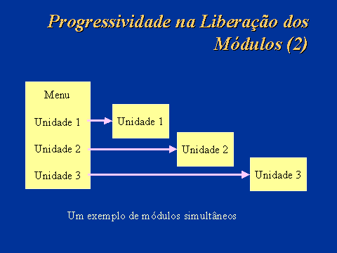 Uma outra maneira de estruturar um curso é mesclar as duas abordagens, a linear e a não-linear. Um exemplo desse tipo de estrutura é mostrado aqui, baseado em um menu. O menu dá acesso não linear a uma estrutura linearmente encadeada. Esse tipo de estrutura é interessante pois permite ao aluno escolher que modo de aprendizagem deseja.